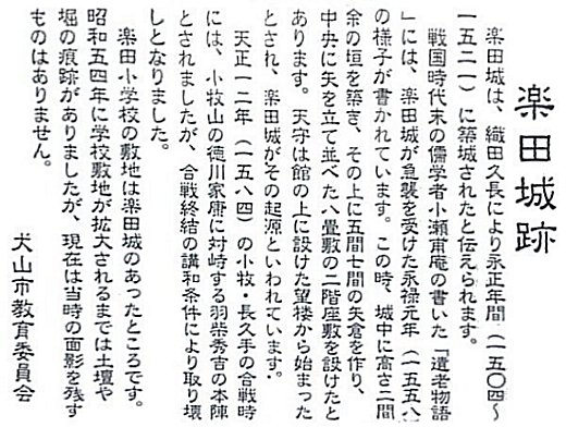 小牧長久手の戦いが終結したときに楽田城は破壊されました。