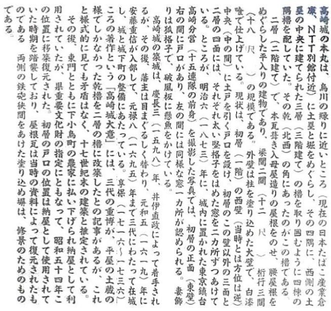 | 高崎藩に伝えられる「高崎城大意」という書物によれば「もとこの櫓こけらふきにて櫓造りになし2階もなく土蔵 |