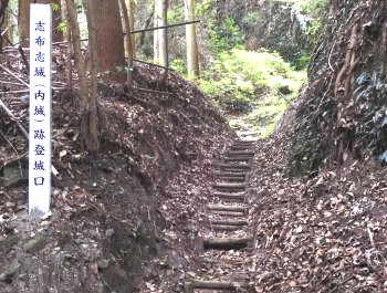 右側に登城口があり、登り切ったところで右折し、少し進んで左折しました。