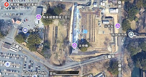 バスで未申櫓の前を通過し南口券売所まで行って、熊本城見学を開始しました。 |