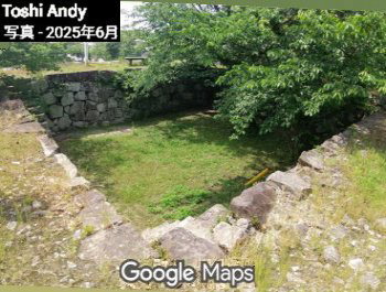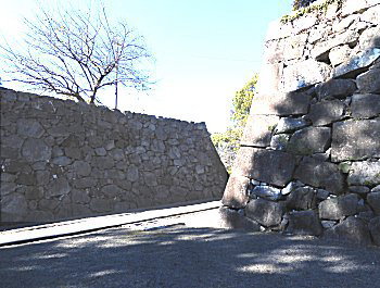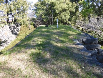 間に長さ三間の塀が続いていました。また石垣には合坂と呼ばれる「V」字型の階段が設けられていました。石垣の石〇には「大」