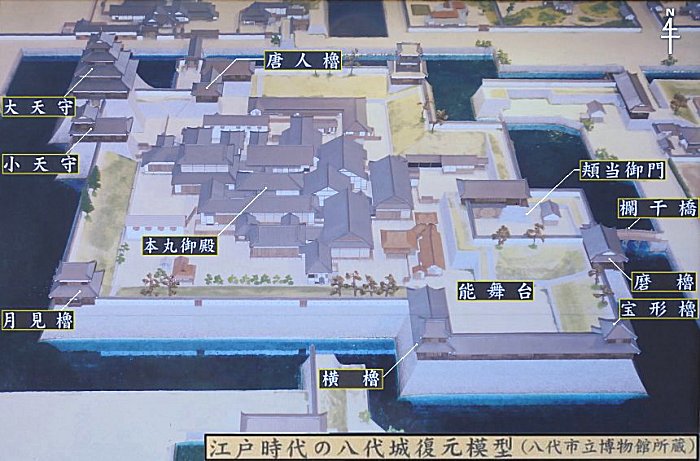 いた櫓門でした。また欄干橋は本来木造の太鼓橋で、八代城築城年を示す元和八年(一六二二)銘の擬宝珠が残されています。