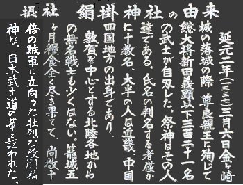 | この碑を建て神霊を慰め奉ることを申し出られた加藤氏は足利高氏の末裔を自認する。滅亡の悲劇 |