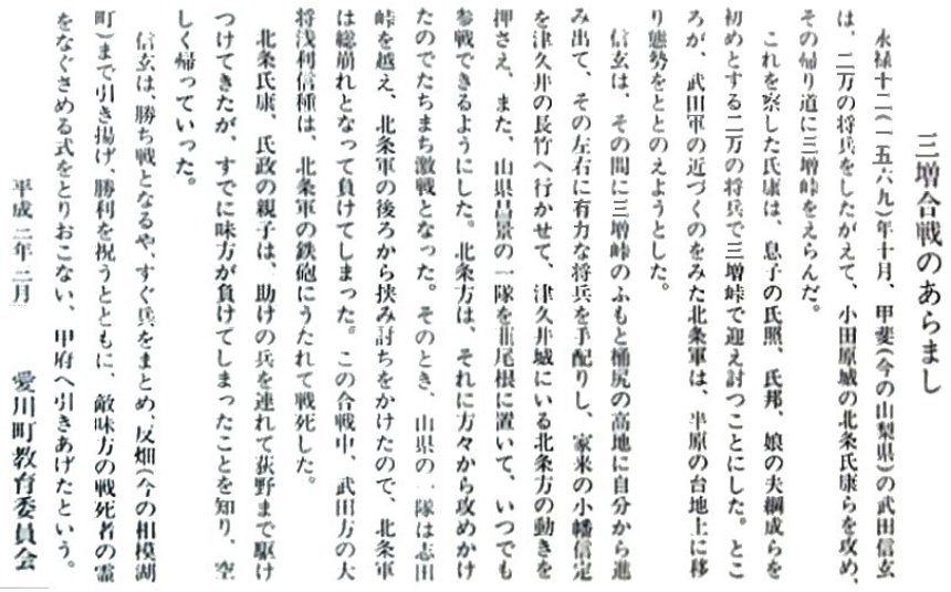 氏康は、息子の氏照、氏邦に待ち受けて攻撃するよう命じて、激突したのが神奈川県愛川町の三増です。
