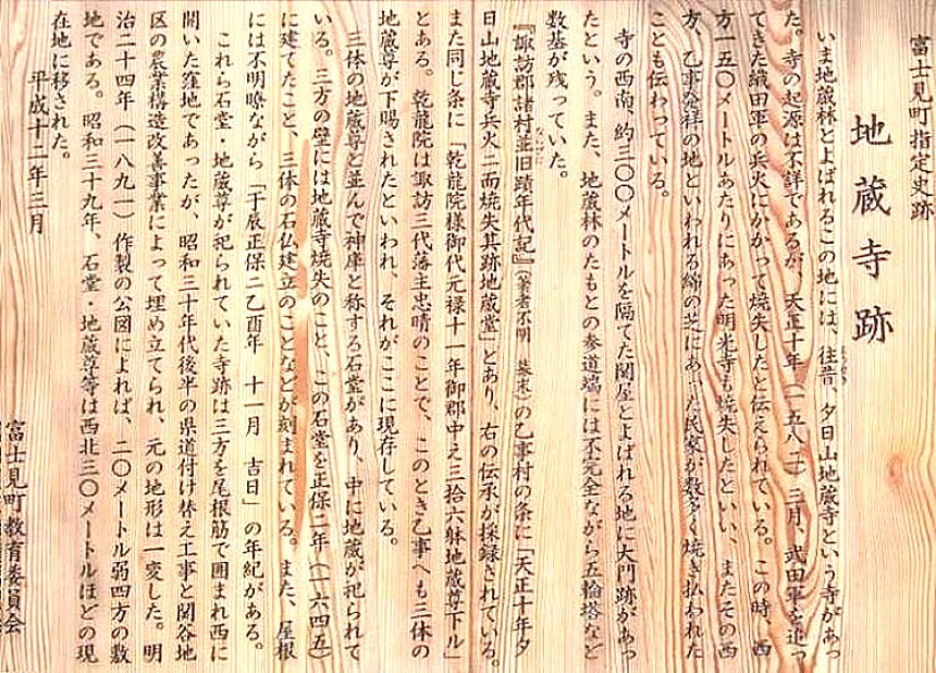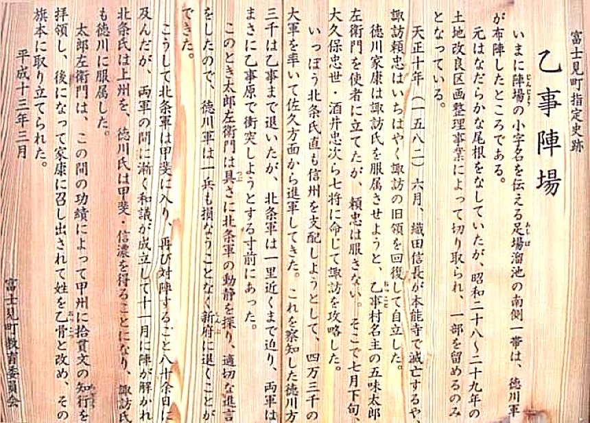 北条氏直も諏訪を支配しようとして軍を進めあわやというとき、 乙事の名主五味太郎左衛門の気転で 徳川軍は一兵も損なうことなく新府に退却しました。