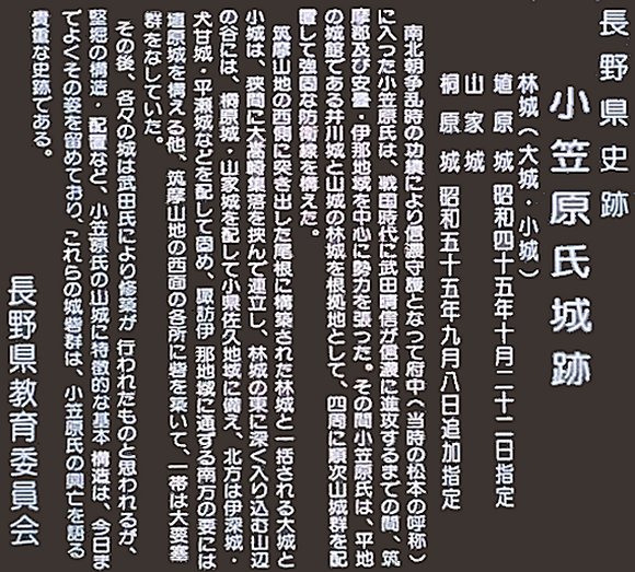 南北朝時代に信濃守護となった小笠原氏は、この地に雄大な城を築き、本拠地としました。 天文17年(1548)、小笠原長時は塩尻峠の戦いで武田信玄に破れ、林城は廃城となりました。