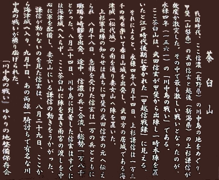第4次川中島の合戦のとき、武田軍が最初に本陣を置いたのが茶臼山だと言われています。
